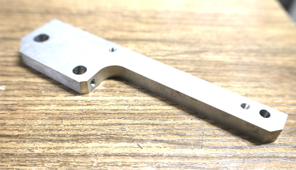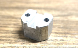 | 材質はアルミ。厚さ12mm×60mm×40mmにて製作。 ドリルにて穴をあけ、仕上げは17Φ・15Φのリーマー加工を行いました。 |