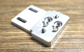 | 製品材質はアルミで、厚さ22mm×35mm×40mm。 角度のある切削を行うよう、プログラミングし製作。 |